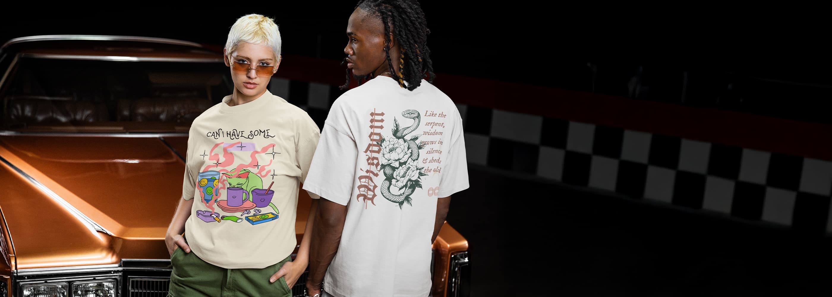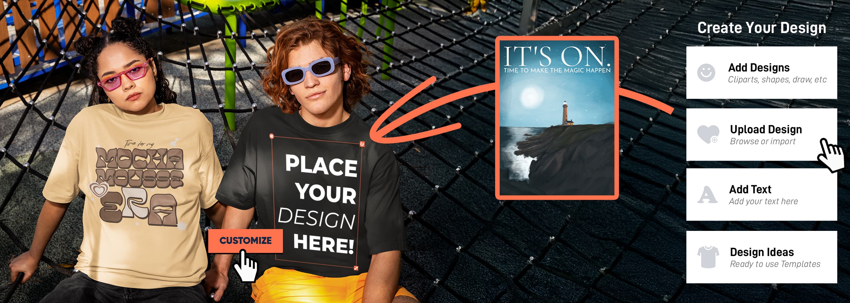 The heart of our services lies in the ability to customize online. With Factory 1, users can design their custom T-shirts online with complete freedom and control. Our user friendly custom design studio is super easy! Enhance your designs by uploading your own files, adding a personal touch that does beyond standard customization. Choose from the extensive collection of pre-designed elements, ensuring your custom T-shirts are a true reflection of your style. Select sizes, colors and quantities with ease and track your order in real time for total confidence and control.