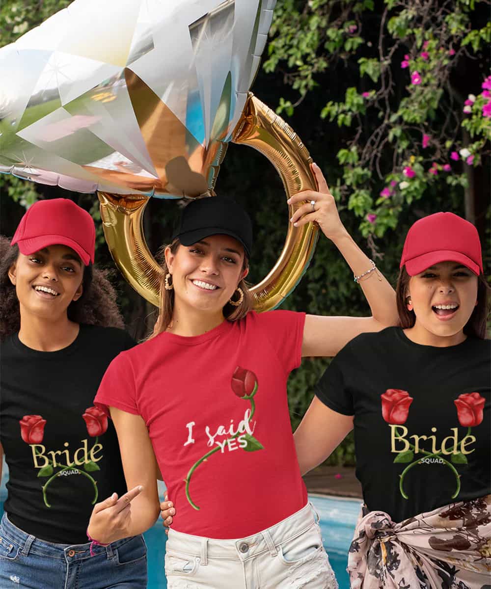 You can design many other types of shirts: from generic bachelorette party t-shirts to bridal team squad group matching t-shirts, team bride t-shirts, themed dream girls bachelorette shirts, friends bachelorette party shirts, funny matching wedding party t-shirts, memorable bachelorette party shirts, and more for your epic party.
