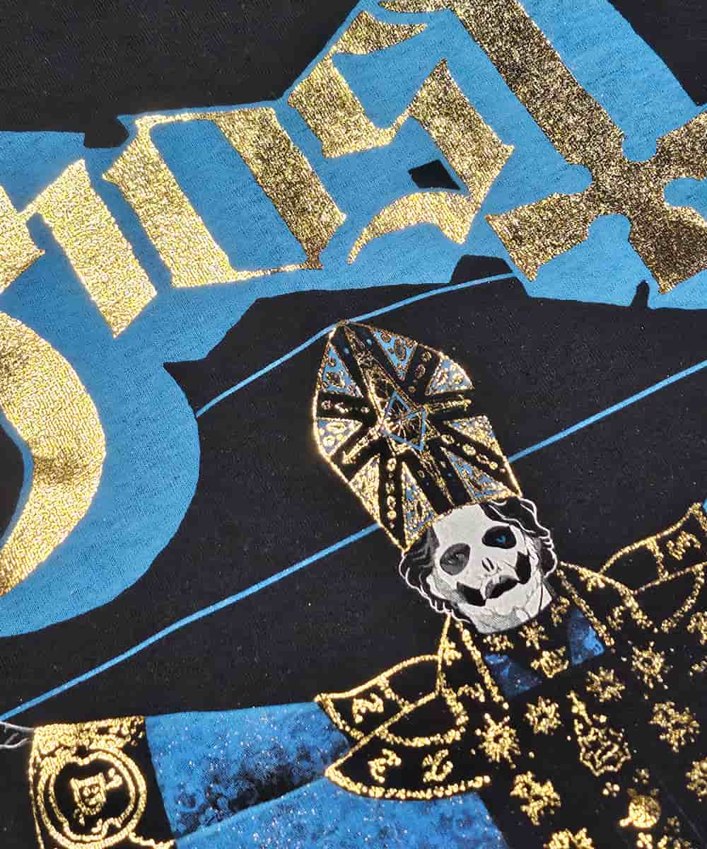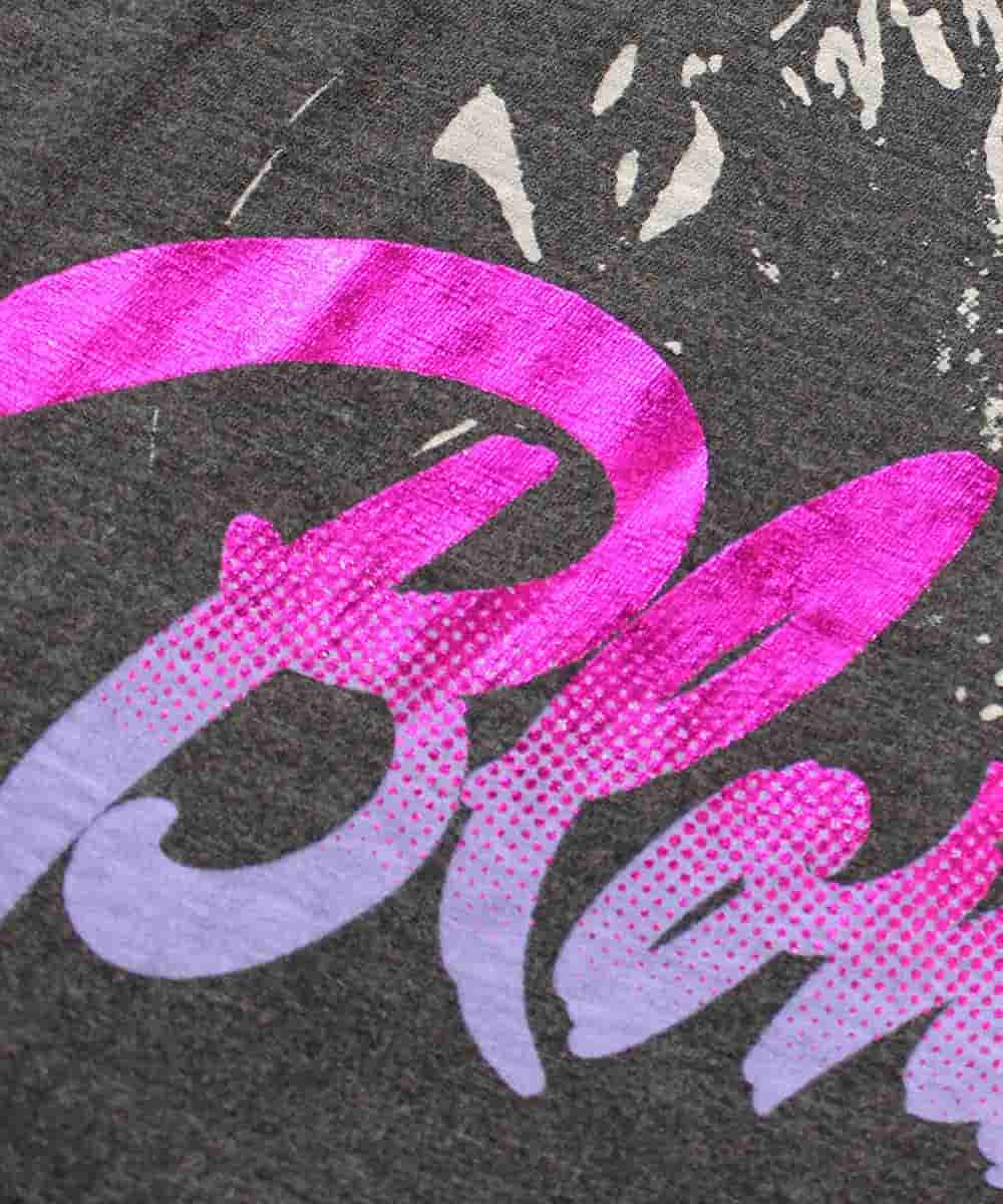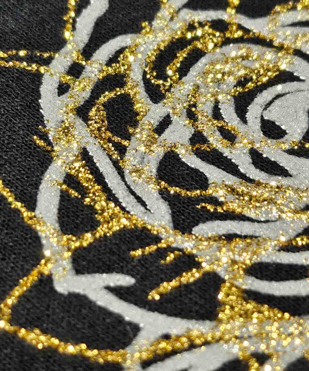 This unique technique combines screen printing with heat-pressed foil to create a striking effect on your garment. The design is first printed with a base ink color that matches the Foil color which enhances the durability under the foil layer. While foil adds a brilliant metallic shimmer, it may require extra care to maintain its longevity. For best results, wash these garments inside out in cold water and air dry to preserve the foil's luster and ensure lasting brilliance.